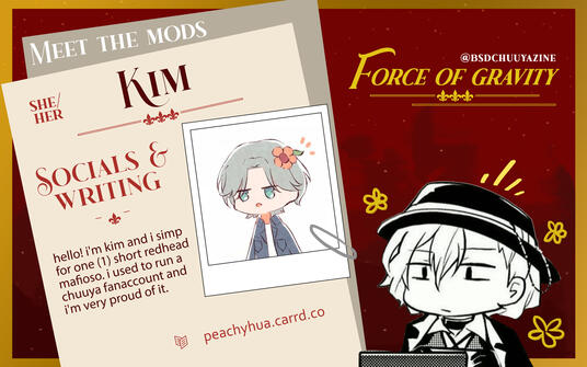 About: Hello! I'm Kim and I simp for one (1) short redhead mafioso. I used to run a Chuuya fanaccount and I'm very proud of it.